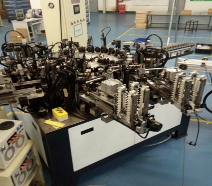 本機為高度自動化生產設備,操作人員將芯柱插入上料輸送鏈后設備上的機械手會自動取料放入工位,然后各機構對芯柱進行定位,自動理絲,自動理外絲,內外絲,定型等動作。整形完畢后會有光纖對8個導絲進行衛視檢測,成型不到位的為空位。我們的送絲機構只需要操作人員將整版燈條進行正負極區分后放入儲料帶,機構自動會對燈條板進行取料,送料,切邊條,然后送至上料齒條。送絲機構有極高的穩定性與實用性,當儲料帶燈條過少時設備會發出聲光報警提醒操作人員及時補料,上料齒條會對1-2個空缺位進行補料處理。